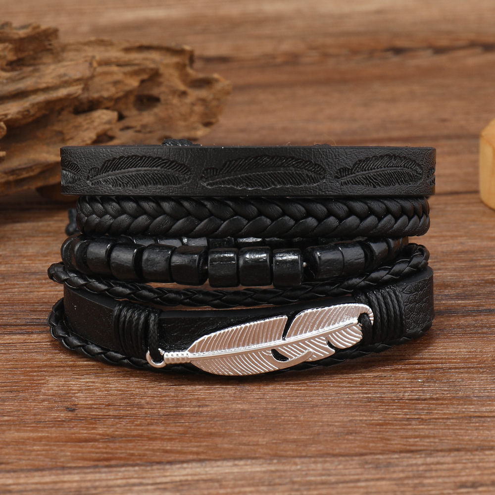 Factory Direct Supply Men's Business Alloy Feather Bracelet Amazon DIY Wooden Beaded Leather Hand Rope Mix