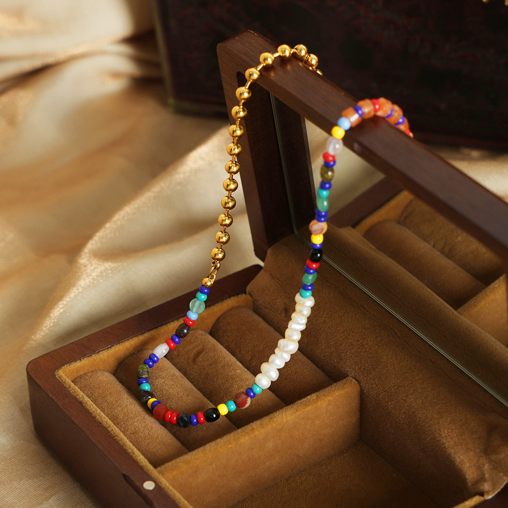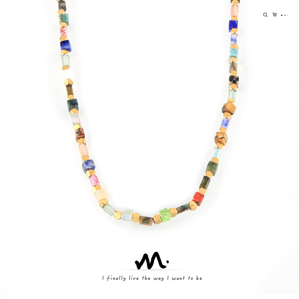 Bohemian Style Elegant All-match Jewelry Mix and Match Natural Colored Stone Handmade Beaded Design Sense Titanium Steel Necklace