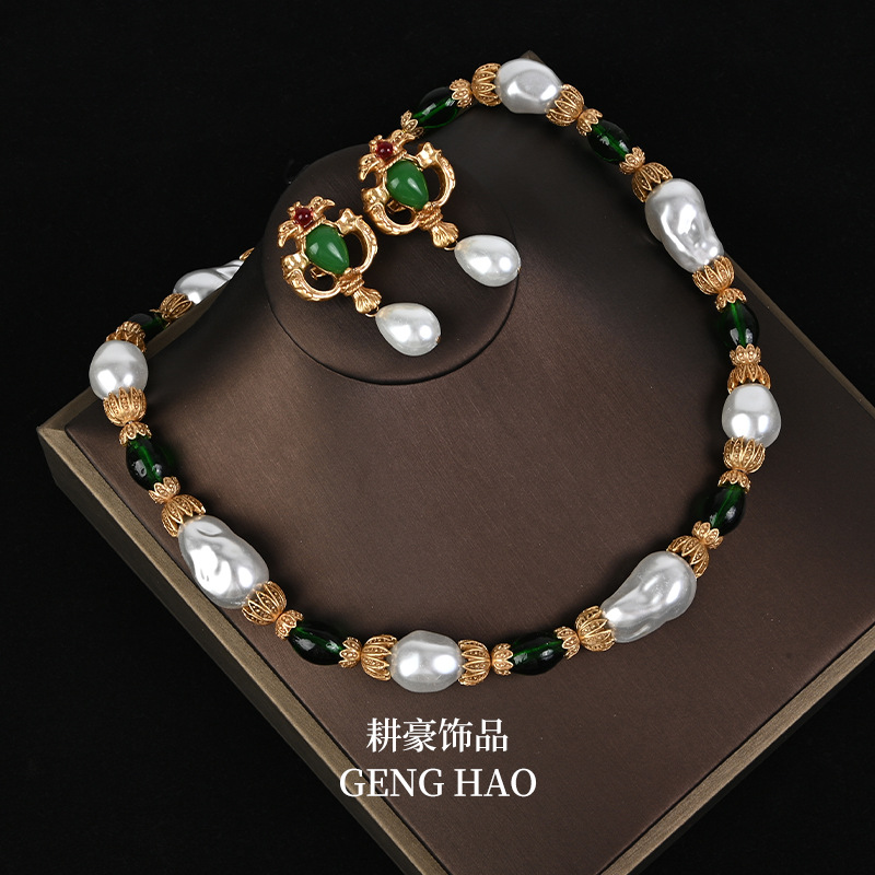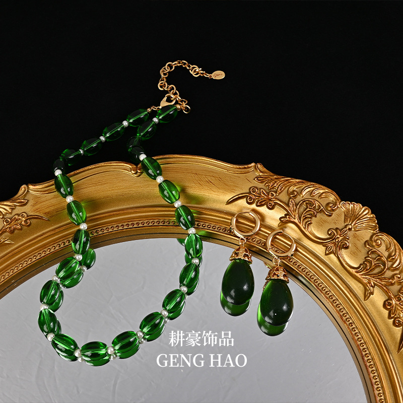 Retro New Chinese Elegant Elegant Green Glaze White Czech Diamond Mix National Style Necklace Earrings suit