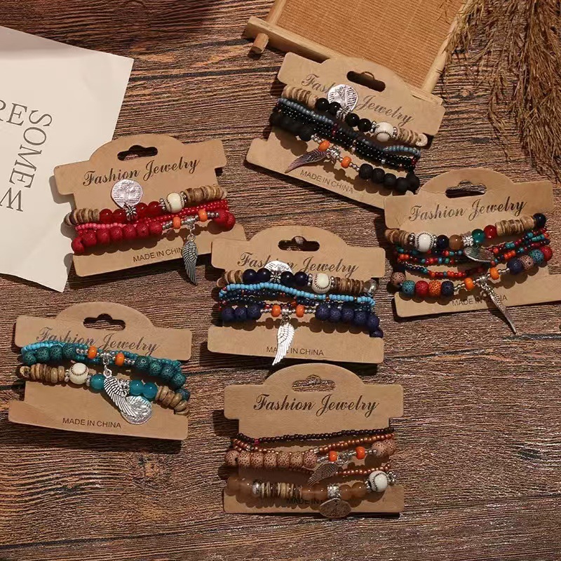 Fashion Bohemian Ethnic Style Wing Pendant with Fine Rice Beads Mixed Layered Women's Bracelet Set