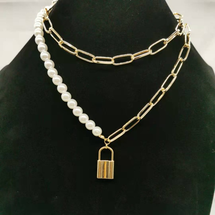 European and American cross-border jewelry fashion temperament alloy mix pearl necklace women's retro generous small lock pendant necklace