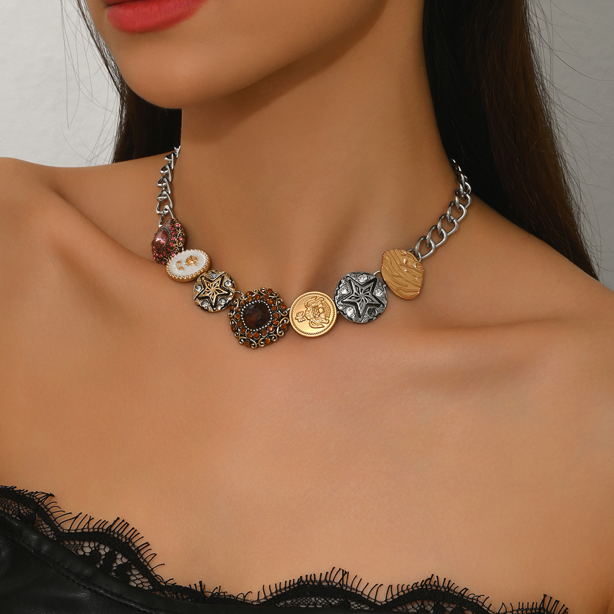 Cross-Border Xiyin Retro Niche Design Metal Chain Mixed with Gemstone Coin Star Pendant Splicing Necklace for Women