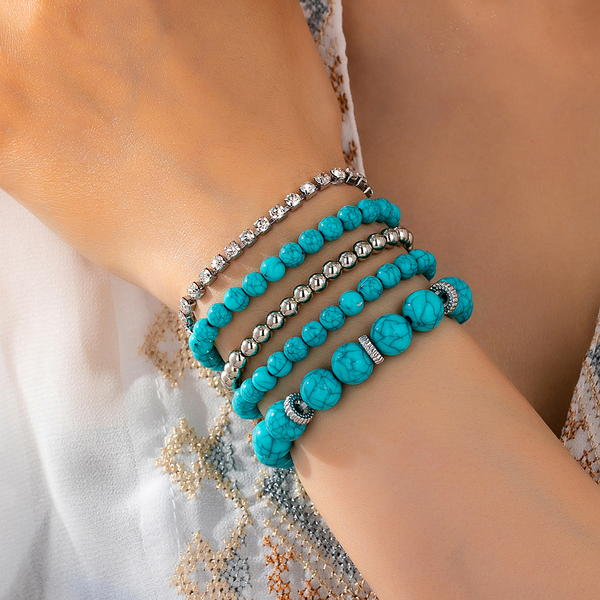 Cross-Border Bohemian Style Personalized Stacking Trendy Multi-Material Mix and Match Turquoise and Silver Bracelet Set for Women