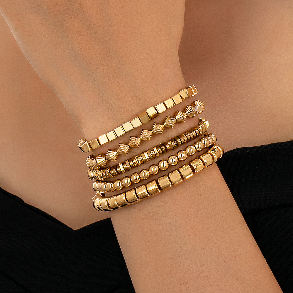 Cross-Border Xiyin Retro Style Light Luxury Personalized Golden Round Beads Square Geometric Texture Mixed Bracelet Five-Piece Set for Women