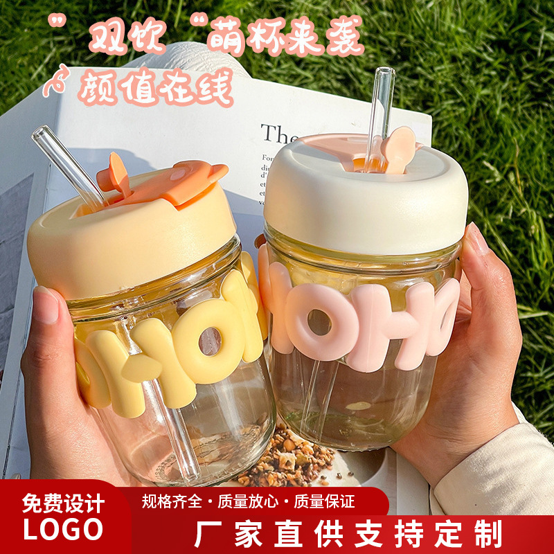 Cartoon Double Drinking Cup, Transparent Glass Cup, High-Looking Anti-Scalding Cute Straw Cup, Pearl Bracelet Letter Water Cup Wholesale