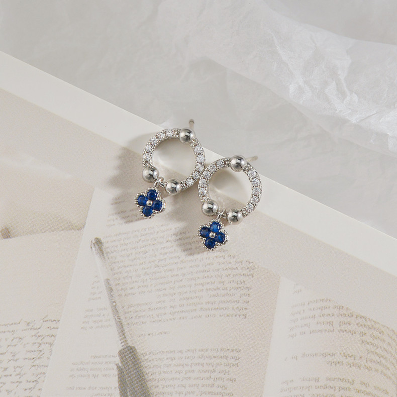 Lucky Grass Earrings with Zircon and Sapphire Mixed Inlay, S925 Silver Needle Earrings, Fresh Style Zircon Inlay