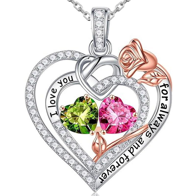 Cross-border exclusive S925 sterling silver double love rose pendant jewelry twelve birthday stone color matching heart-shaped necklace