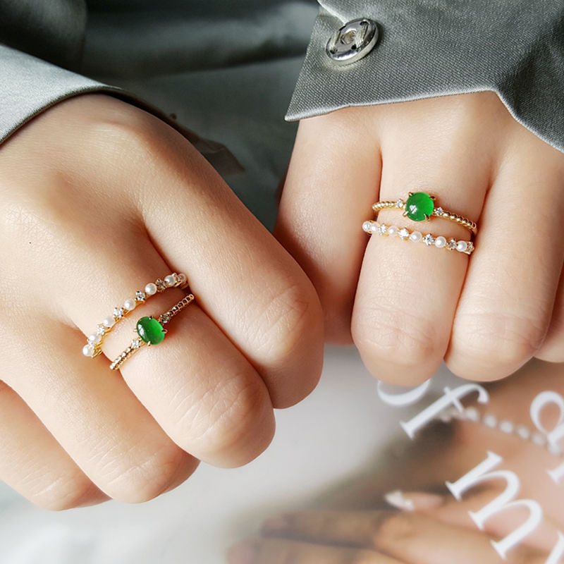 Imitation Natural Chalcedony Sunny Green Egg Face Ring with S925 Silver Plating and Pearl Mix Japanese Style Small Ring for Women