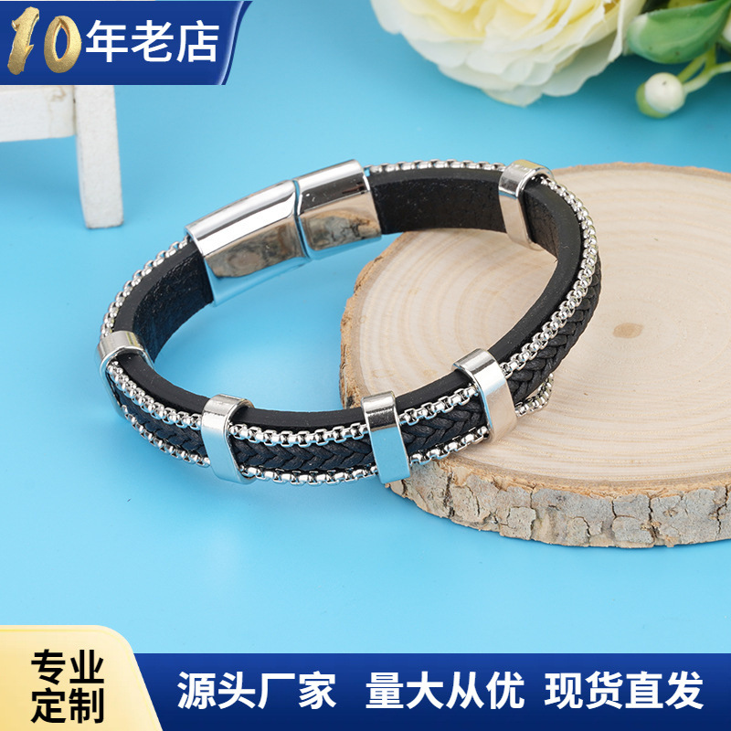 Trendy brand creative stainless steel mix leather rope bracelet domineering men's stainless steel fashion Mingke bracelet wholesale