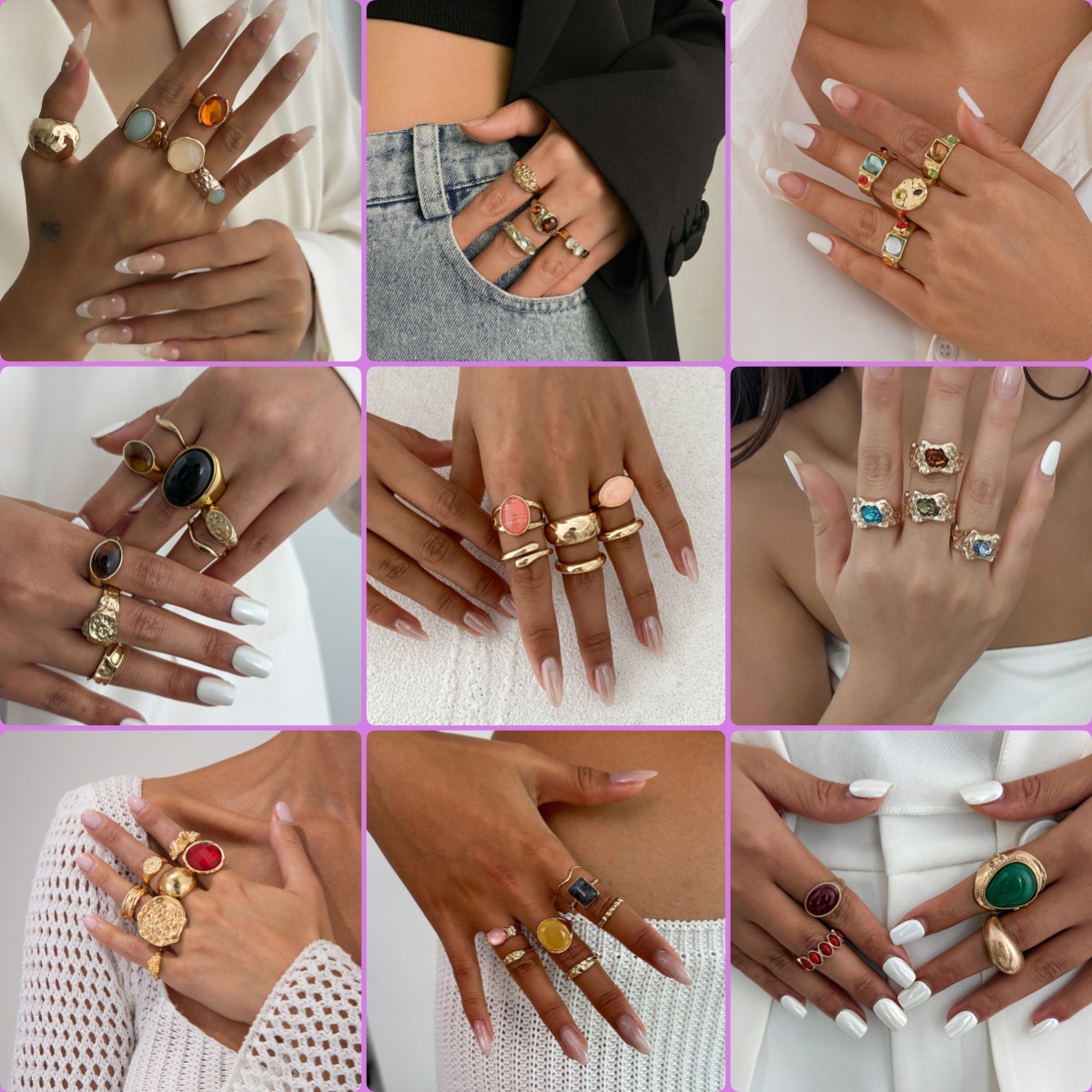 European and American Cross-Border Jewelry, Mixed and Stacked Gemstone Ring Set for Women, Retro Niche Texture Open Ring Bracelet