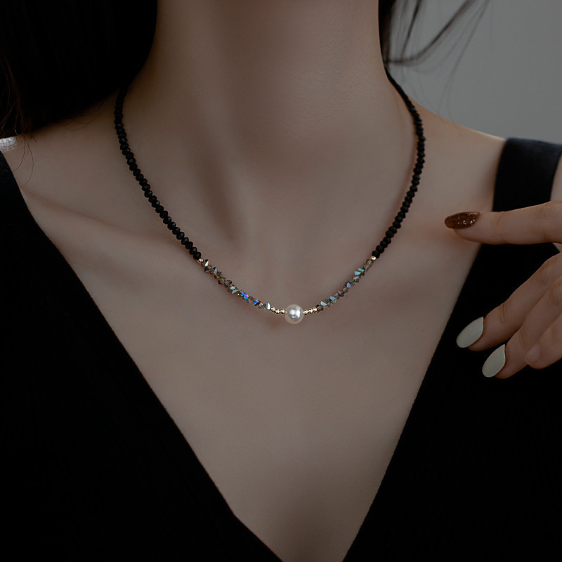 Black Crystal natural pearl necklace retro advanced niche design simple all-match necklace mix and match pearl necklace
