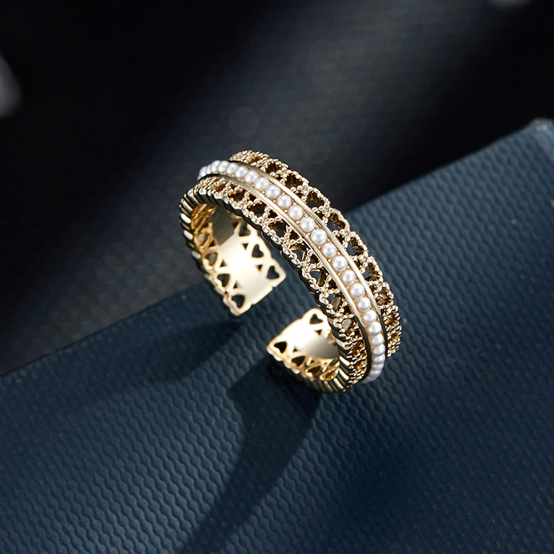High-End Light Coffee Lace Pearl Heart Cut Out Open Ring Sweet and Cool Mix and Match Stackable Adjustable Ring