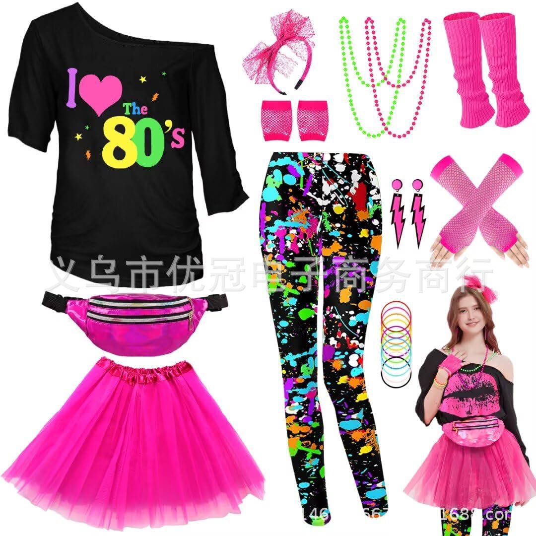 80s Neon Family Party Women Short Sleeve Colorful Yoga Pants Necklace Bracelet Lace Bow Headband Waist Bag