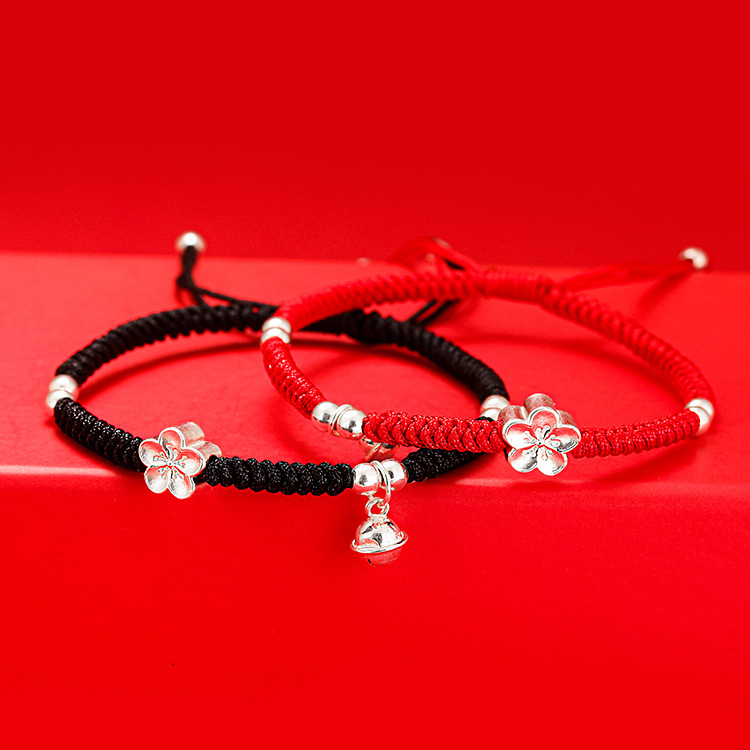 Sterling Silver Peach Blossom Bell Red Rope Couple Bracelet Hand-Woven Pure Silver 999 One Step at a Time Peach Blossom Luck Bracelet