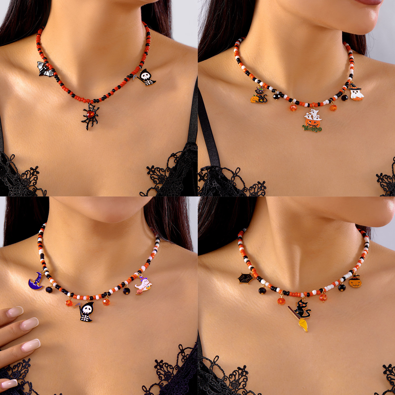 Halloween Jewelry Fashionable and Versatile Pumpkin Color Horror Style Ghost Spider Pendant Handmade Rice Beads Beaded Necklace