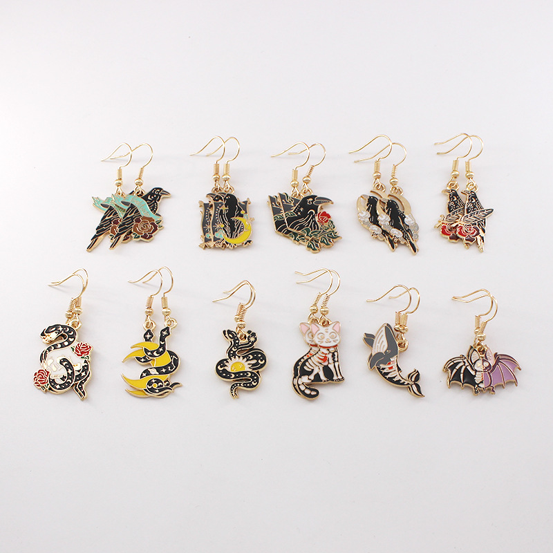 Halloween Series Earrings Horror Funny Personalized Crow Bat Snake Alloy Oil Dropping Earrings European and American Hot Selling Jewelry