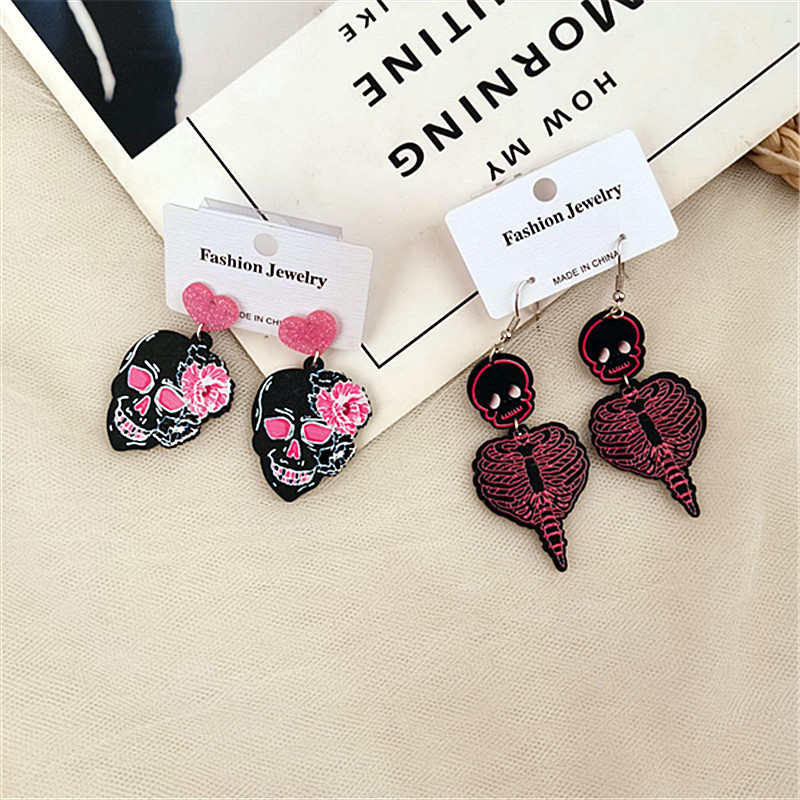 European and American Halloween acrylic carved printing skull skeleton graffiti funny horror personality love retro earrings