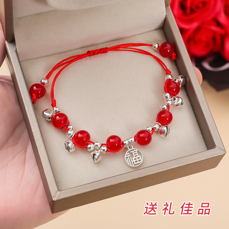 Miao Jiang Girl Red Agate Bell Bracelet Women's Step-by-Step Lucky Brand Bell Hand Woven Rope Bracelet for Girlfriends New Year