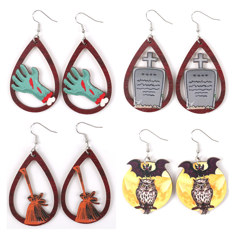 Cross-border Hot Halloween Witch Hat Zombie Hand Medicine Bottle Bat Wood Earrings Horror Funny Printed Earrings