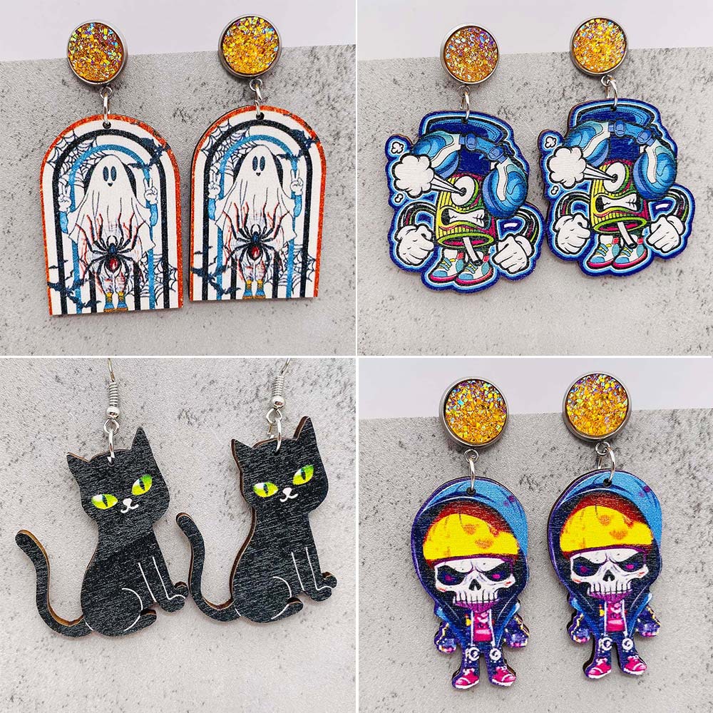 European and American cross-border Halloween jewelry ghost cat horror pumpkin wooden earrings Amazon Halloween earrings