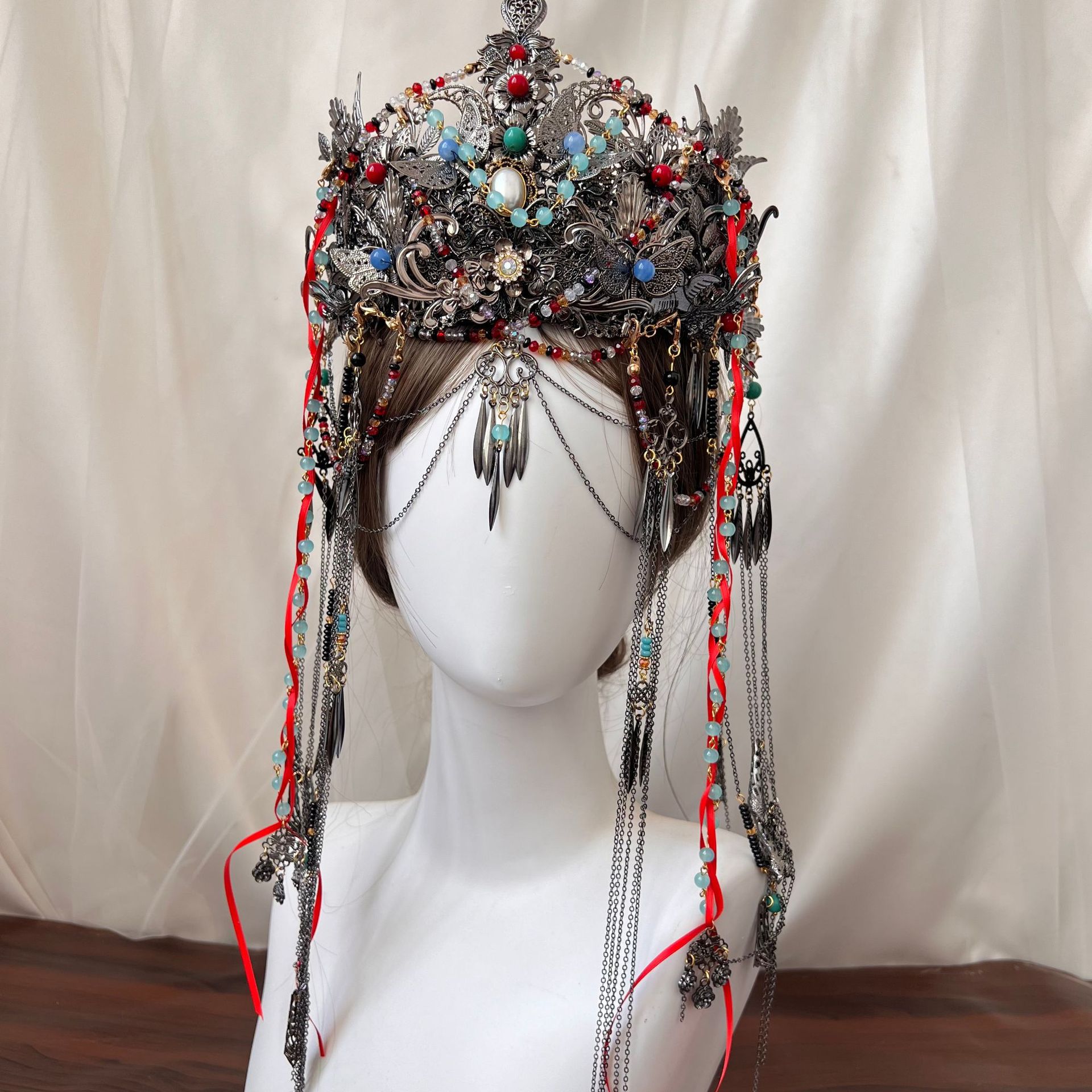 Chinese-Style Cosplay Horror Aesthetic Headwear Exotic High Priest Hair Accessory Ancient Hanfu Retro Black Tassel Hair Crown for Women