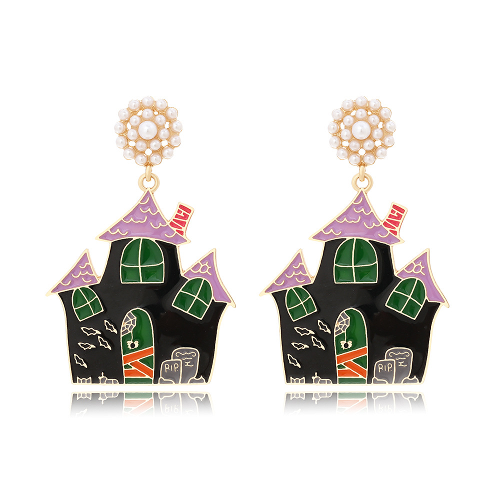 European and American Creative Alloy Oil Drops Horror Haunted House Pendant Earrings Fun Halloween Ghost House Earrings Women Cross Border
