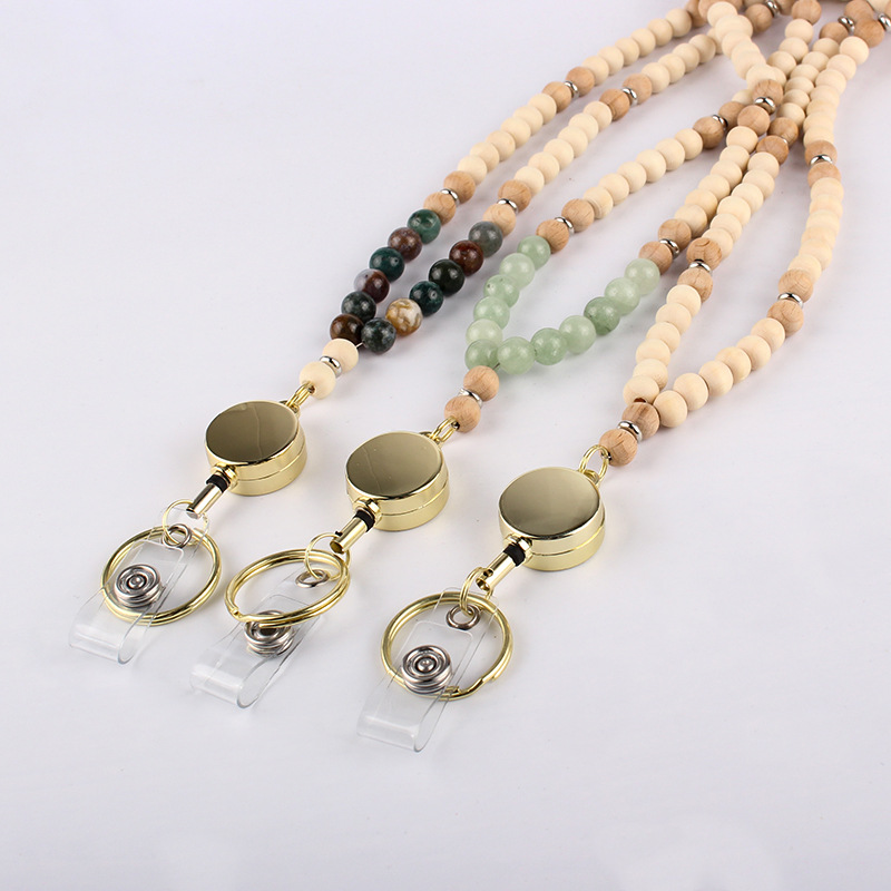 Cross-border Retractable Wooden Beads Lanyard Male and Female Identity Card Badge Classic Retractable Natural Stone Wooden Beads Necklace