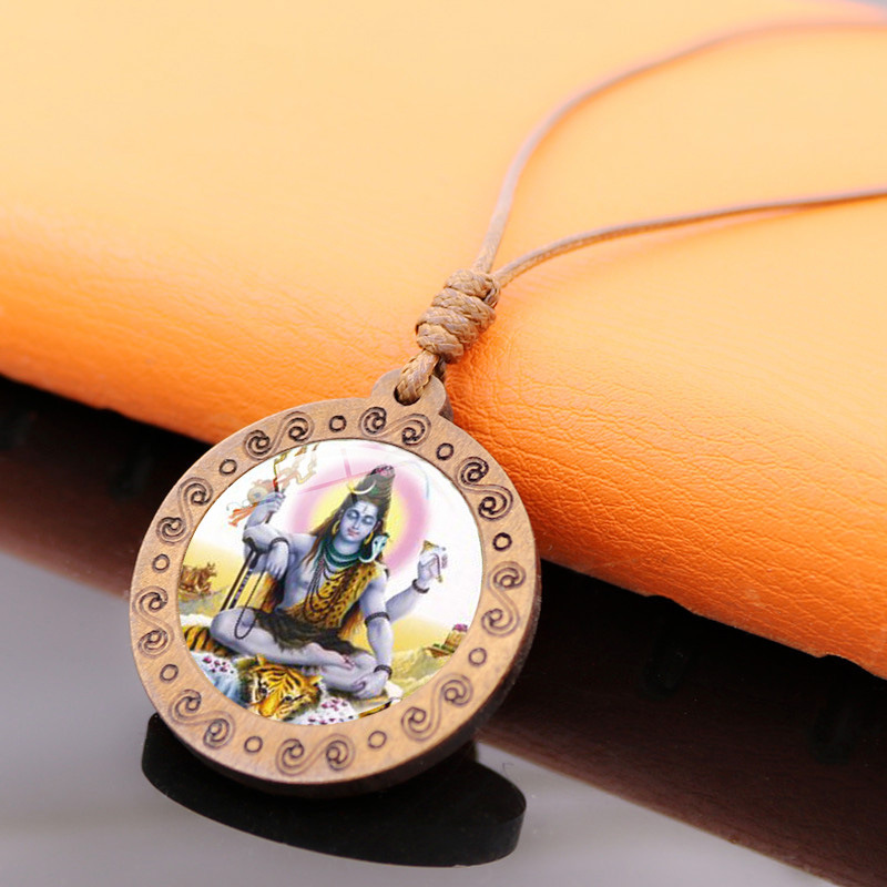 Indian God Shiva Time Gem Glass Wooden Pendant Retro Brown Wax Rope Necklace Women's European and American Fashion Necklace