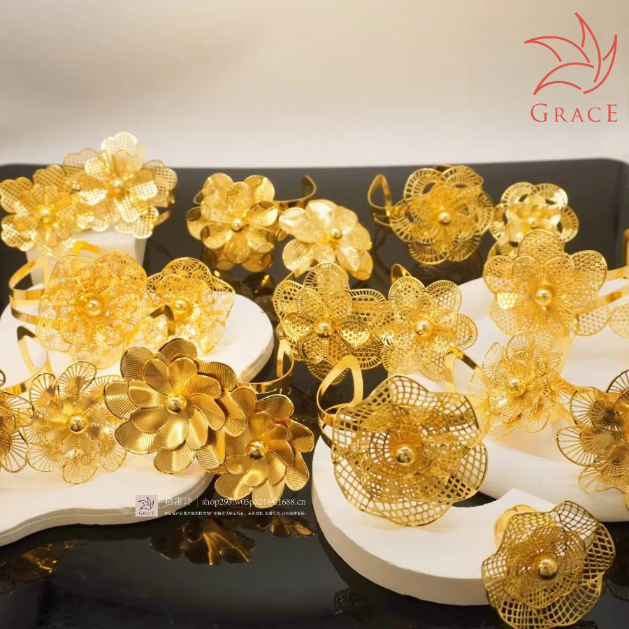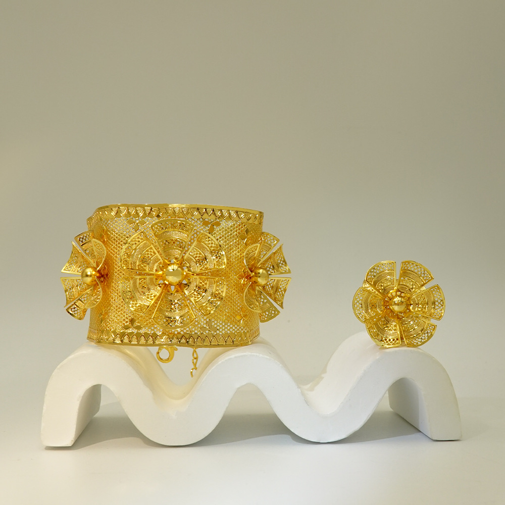 Cross-Border New Style Real Gold Plated Hollow Three-Dimensional Large Flower Bracelet Ring Set Color-Preserving Indian African Gold Bracelet