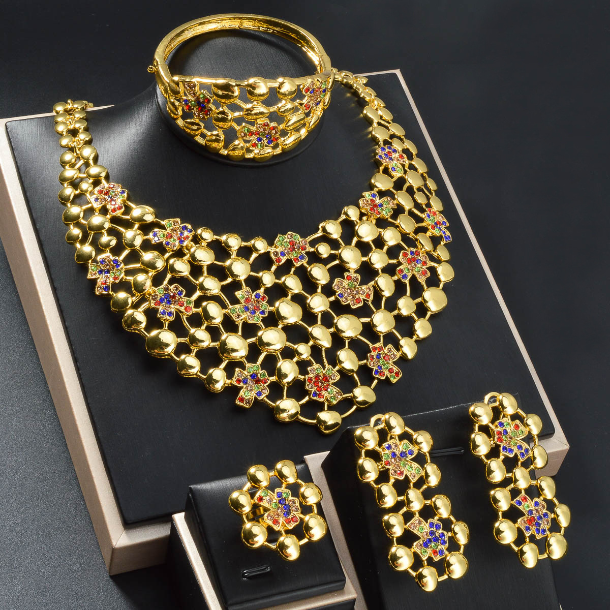 Dubai Cross-Border 18K Gold Necklace Earrings Bracelet Ring Net Bead String Diamond Indian Nigerian Jewelry Set