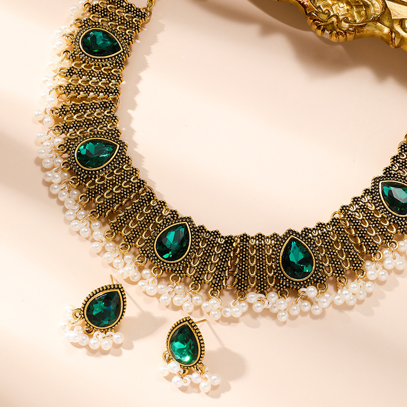Vintage Indian style necklace earrings suit exotic exquisite Pearl Rhinestone tassel clavicle chain earrings Court