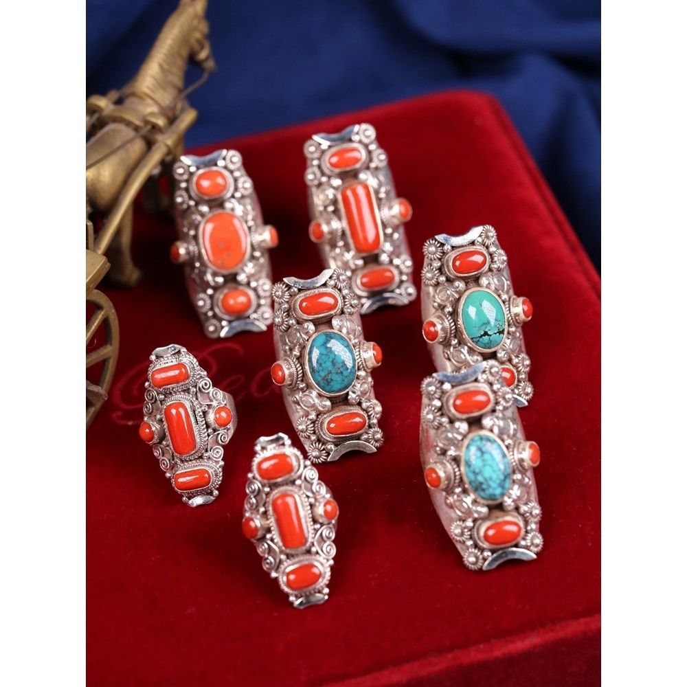 Nepal India s925 Plating Handmade Design First Jewelry Large Turquoise Red Treasure Ring for Men and Women Ethnic Style Vintage