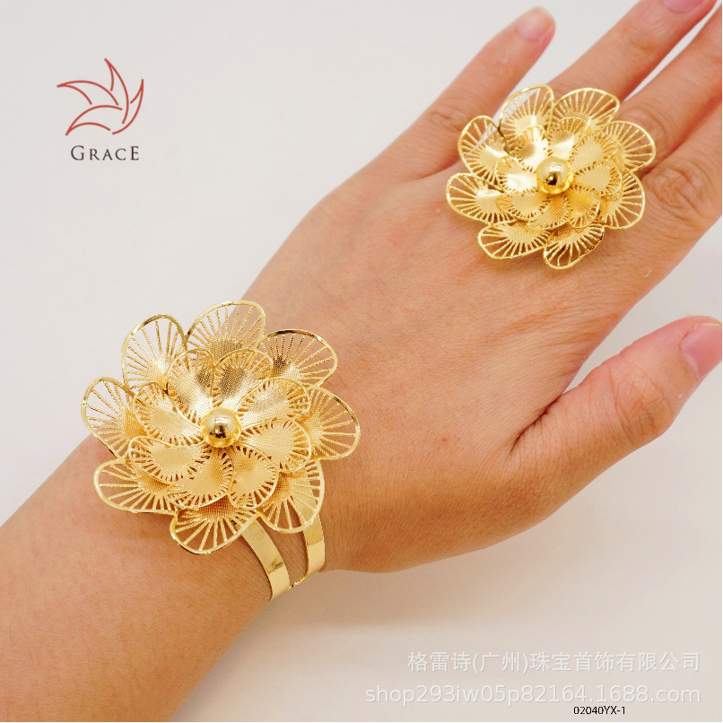 Cross-Border Flower Hollow Bracelet Ring Set for Women Dubai India Nigeria Open Ring Wedding Jewelry