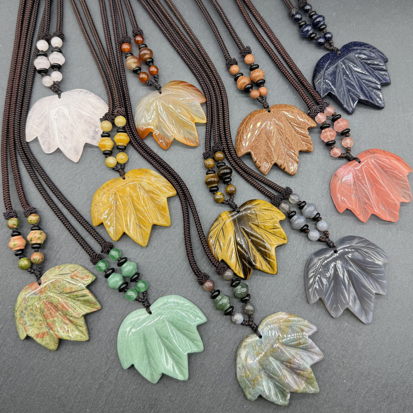 Natural Crystal Agate Semi-Precious Stone Canadian Maple Leaf Necklace Tiger Eye Pink Crystal Green Aventurine Leaf Pendant Sweater Chain