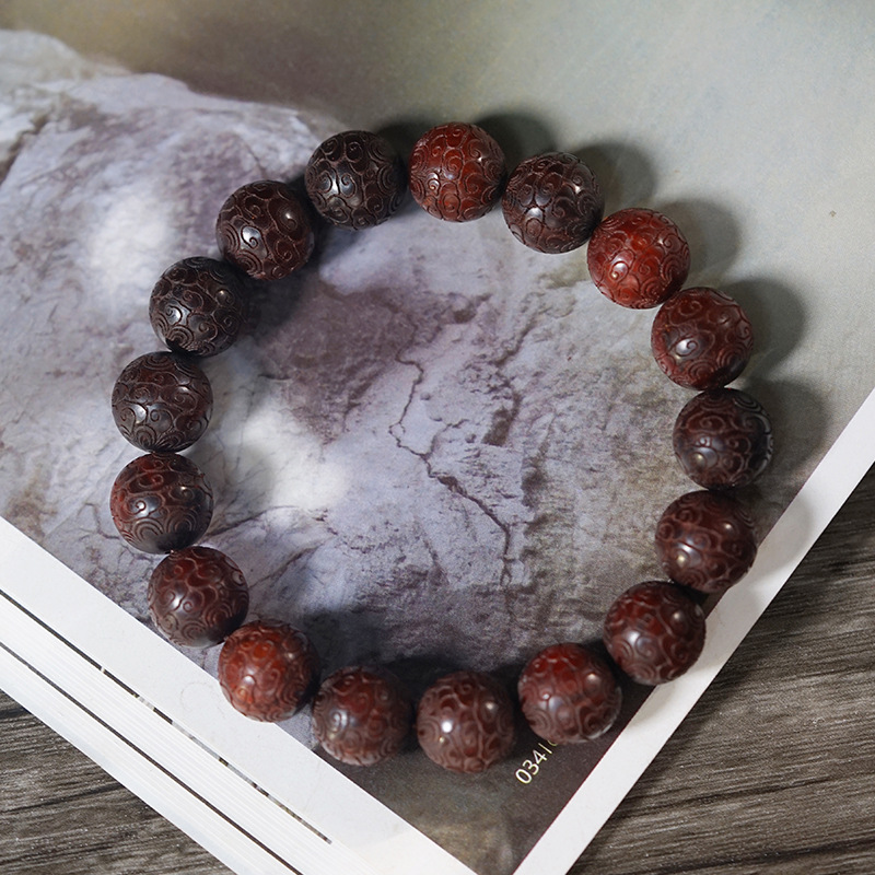 Indian Small-Leaf Red Sandalwood Carved Beads Auspicious Cloud Buddha Bead Bracelet Single Loop Men's Prayer Beads Cultural Bracelet