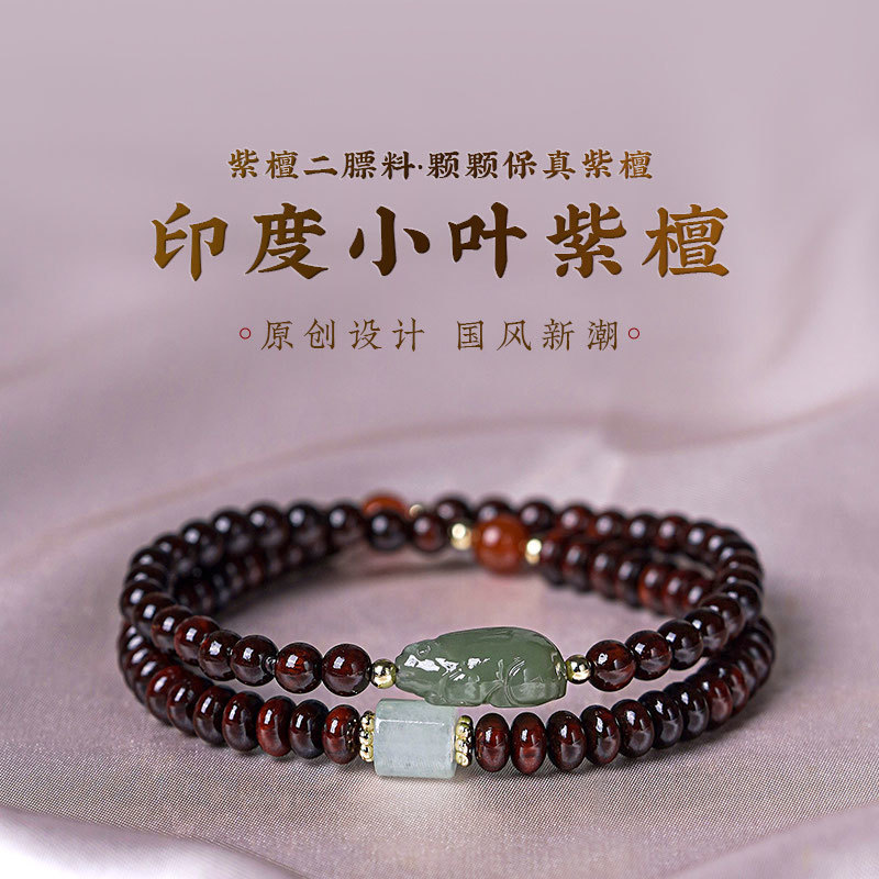 Indian Small-Leaf Red Sandalwood Bracelet for Men, Hetian Jade, Lucky Pixiu Abacus Beads, Sandalwood Wooden Toy Double-Circle Bracelet for Women