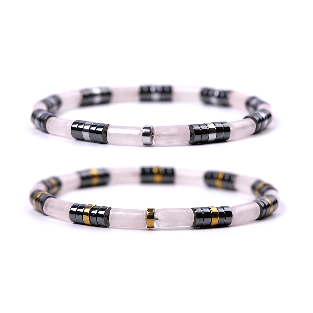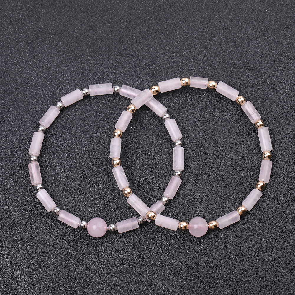 Bohemian Style Natural Pink Quartz Cylindrical Bracelet with Black Flash Pattern Semi-Precious Stone Beach Casual Bracelet