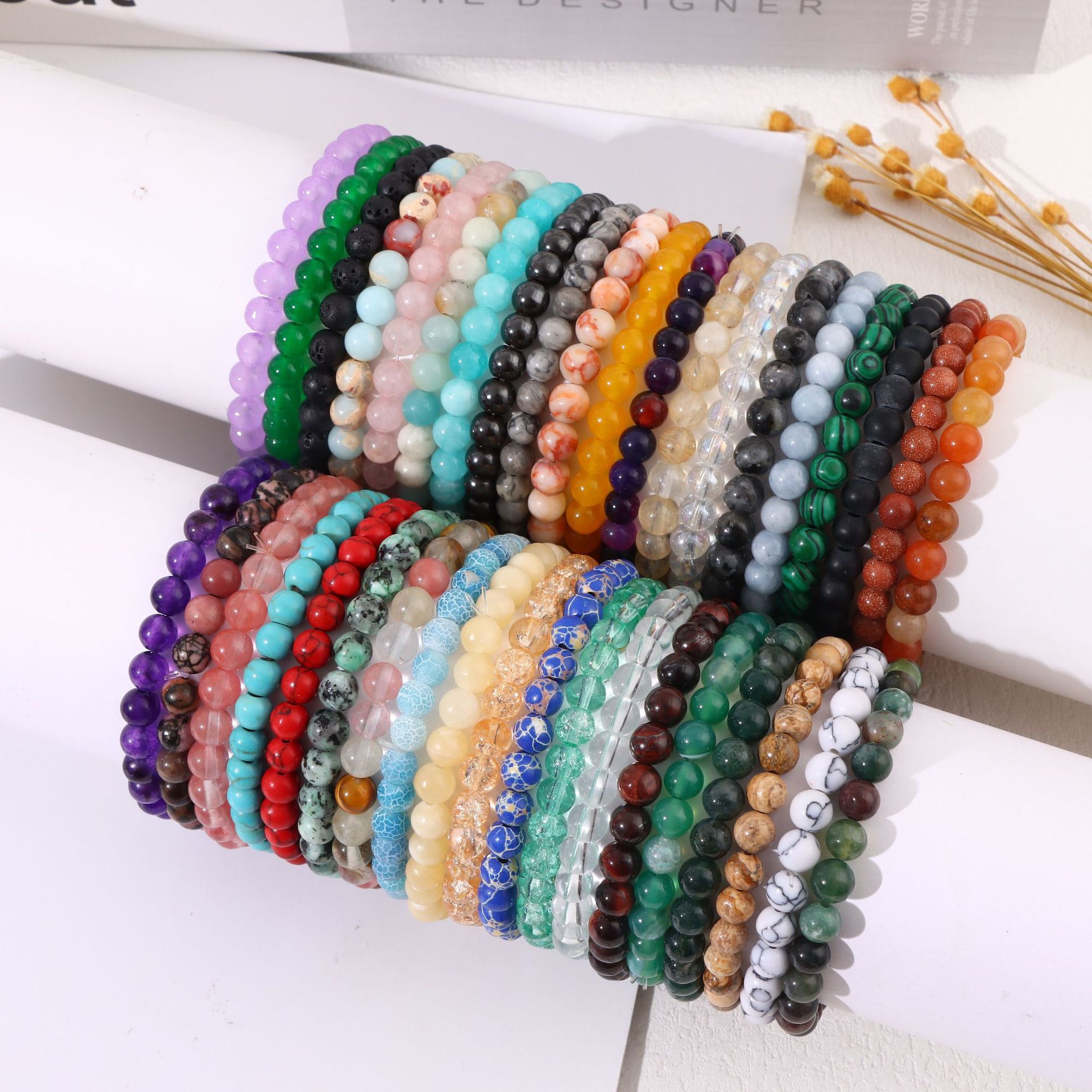 Cross-Border Popular 6mm Natural Stone Round Bead Couple Bracelet, Fashionable Elastic Cord Beaded Bracelet for Men and Women, Stackable Jewelry