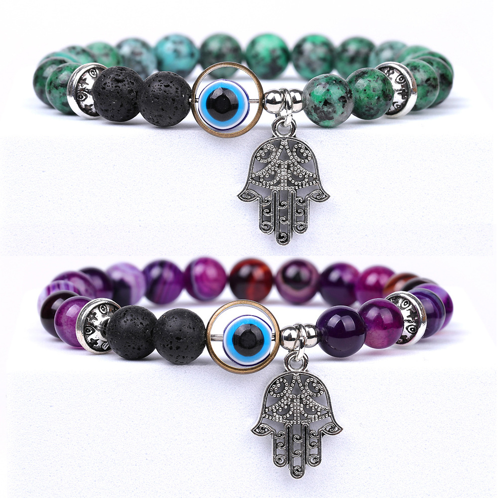 Purple Striped Agate Ancient Bronze Turkish Blue Devil's Eye Bracelet Hand of Fatima Pendant Bracelet