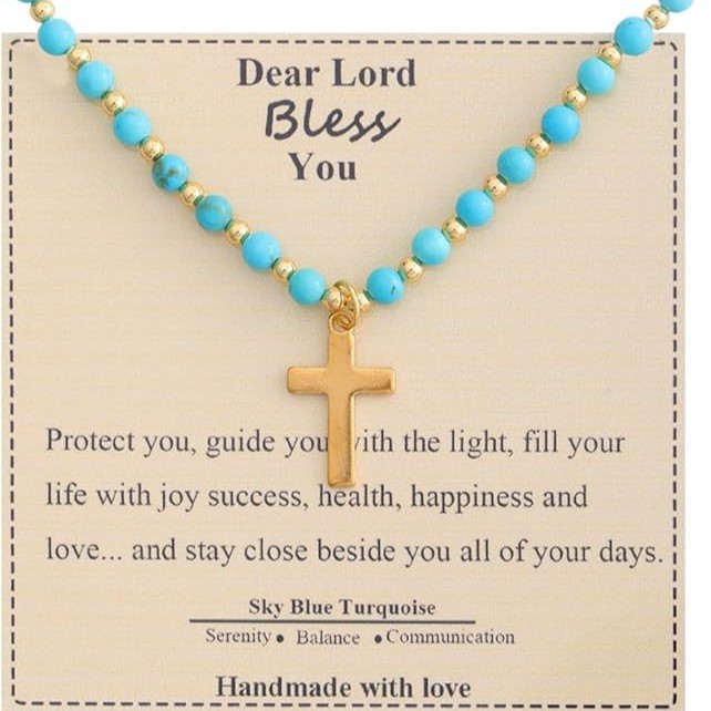 Amazon Best Selling Natural Stone Gold Beaded Necklace Blue Turquoise Pink Zebra Emperor Stone Beaded Cross Necklace