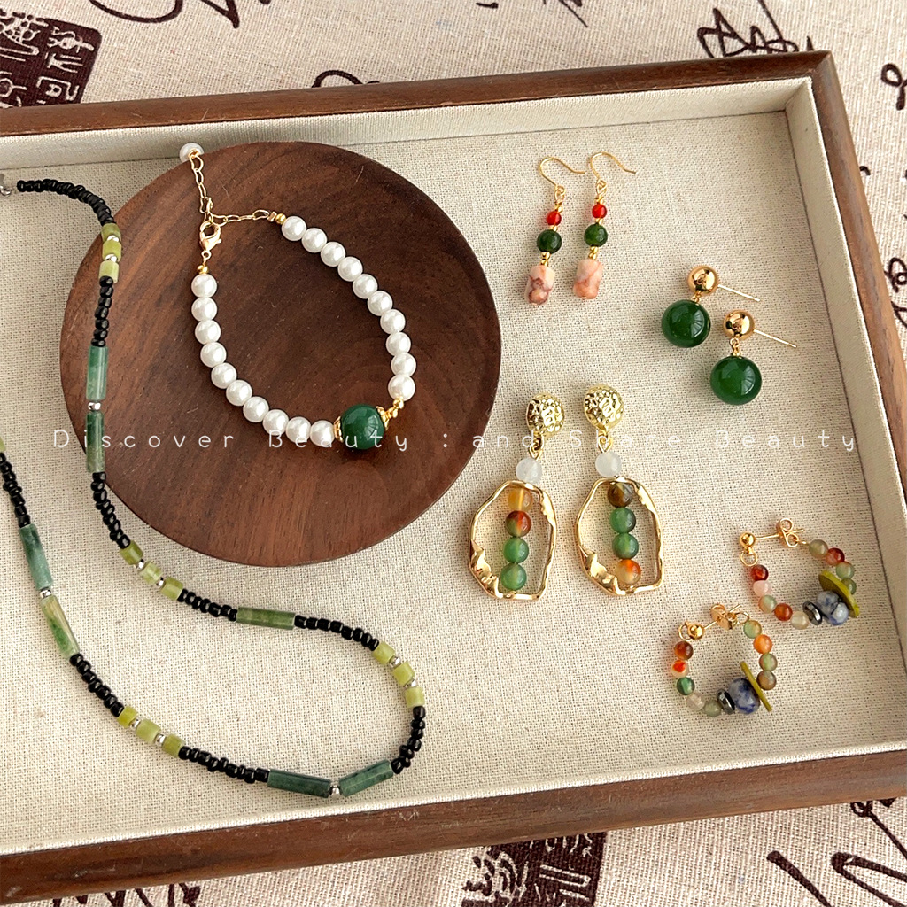 Retro Handmade Natural Stone Necklace New Chinese Style Green Agate Jewelry Set Chinese Style Hanfu Earrings Wholesale High-End