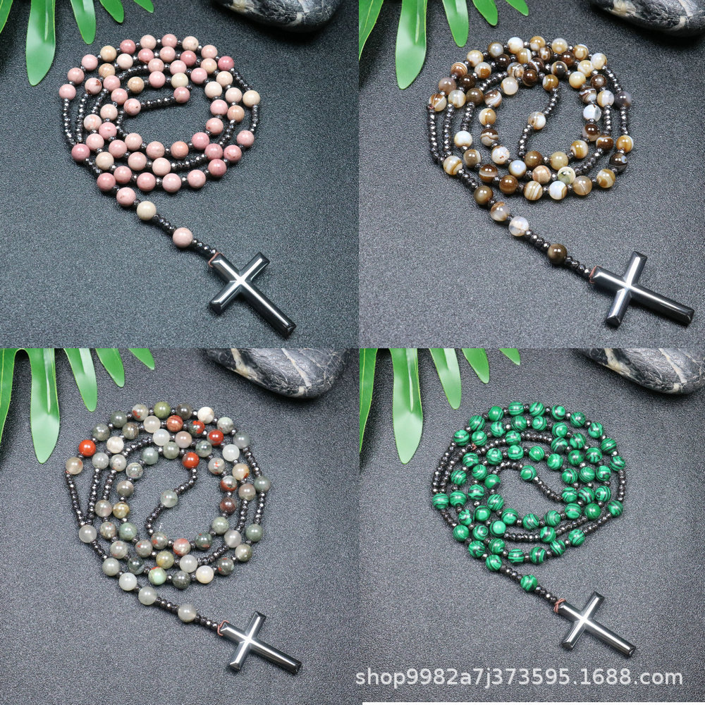 Natural stone handmade beaded Mala rosary necklace iron gall cross wish pendant men's necklace wholesale