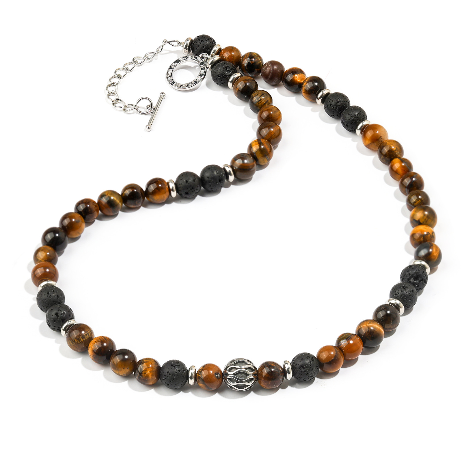 Men's Gift Necklace Xizang Silver Through-Hole Spacer Beads Volcanic Stone Beads Natural Encouragement Ot Clasp Tiger Eye Stone Men's Necklace