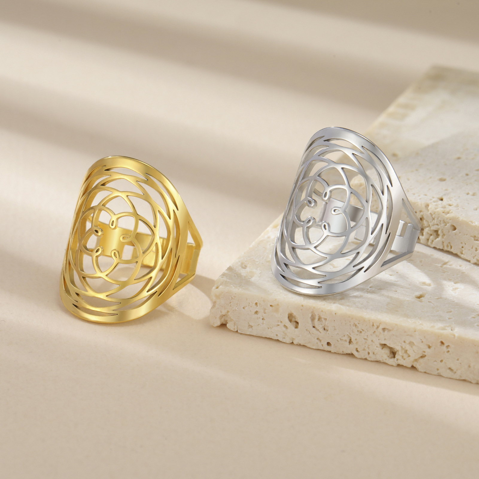 Cross-border Simple Fashion Ring Titanium Steel Sunflower Hindi Hollow Pattern Men's and Women's Stainless Steel Open Ring