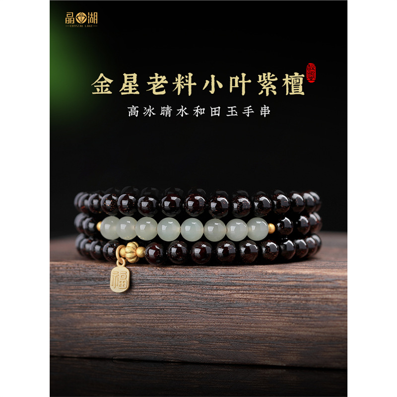 Natural Indian Small-Leaf Red Sandalwood Bracelets for Men and Women, Xinjiang Hetian Jade Bracelets, Old Material, Black Sandalwood Beads, Buddhist Beads, and Toy Trays