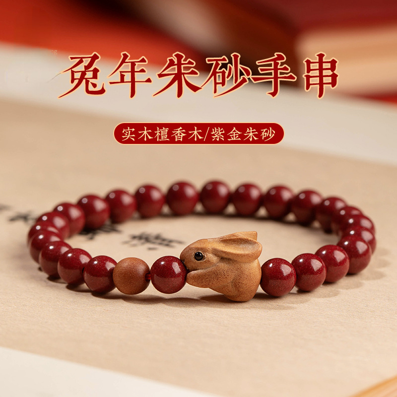 Raw ore cinnabar rabbit year bracelet female Indian Laoshan sandalwood birth year bracelet ancient ethnic style gift new