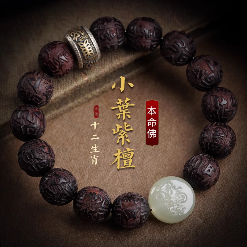 Indian Small-Leaf Rosewood Bracelet for Men, Hetian Jade Bracelet for Women, Birth Year Buddha, Zodiac Snake, Meditation, Six-Character Mantra