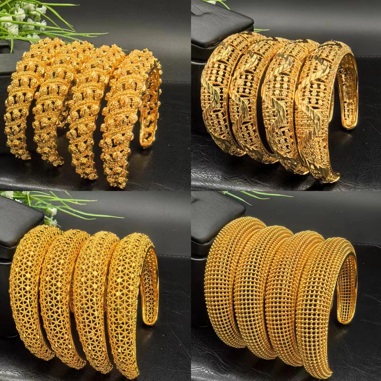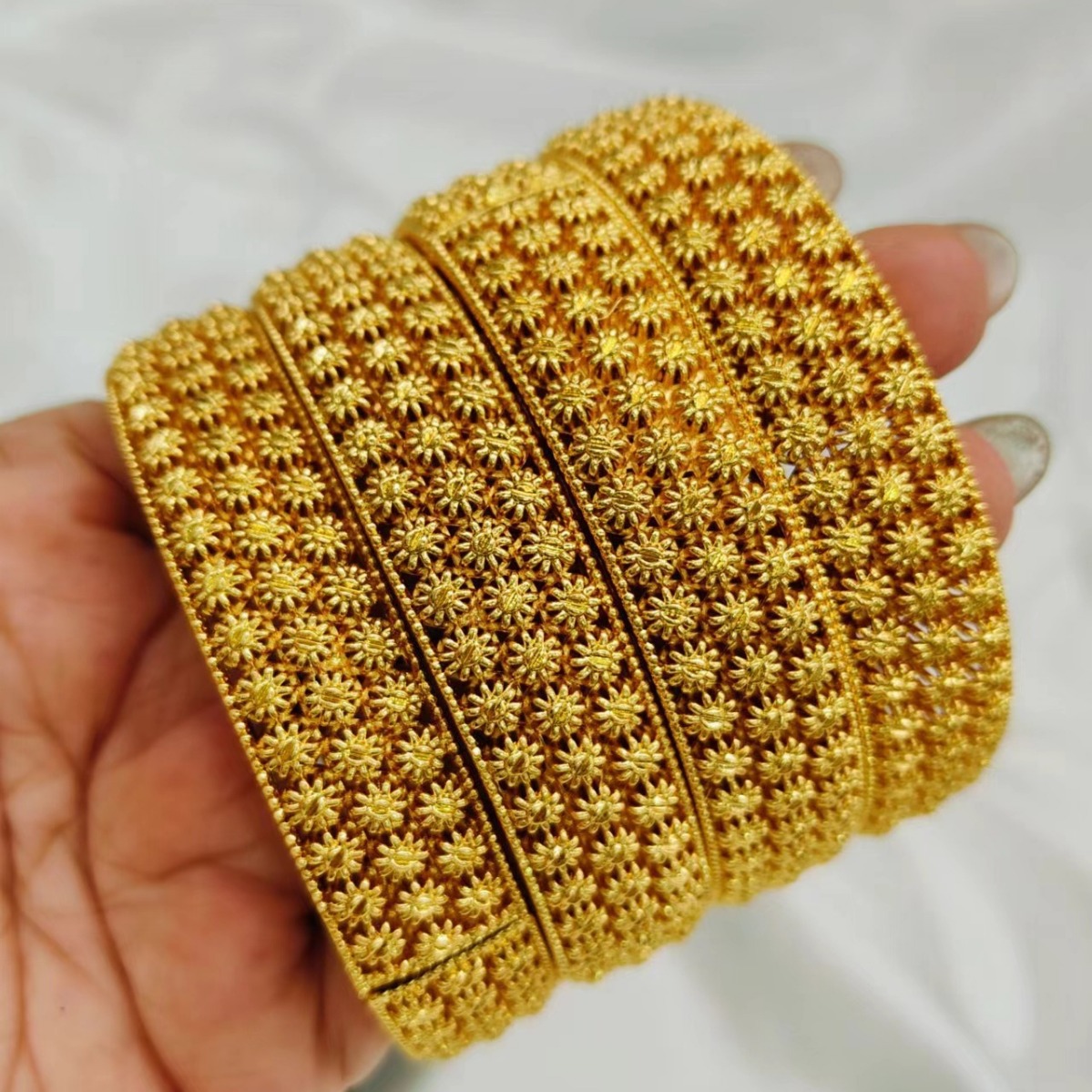 24K Gold Plated Bangles Dubai Wedding Indian Nigerian Women Bridal Sand Gold Jewelry Flower Hollow Bangles
