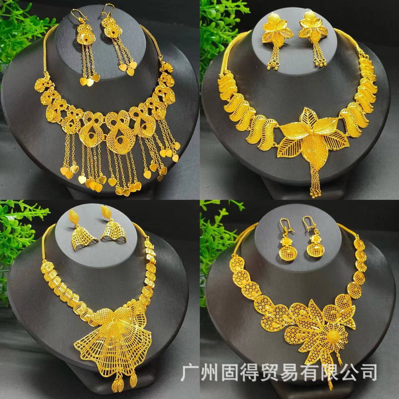 Cross-border hot sale 24k gold flower necklace earrings jewelry suit Indian African ethnic style jewelry set jewel