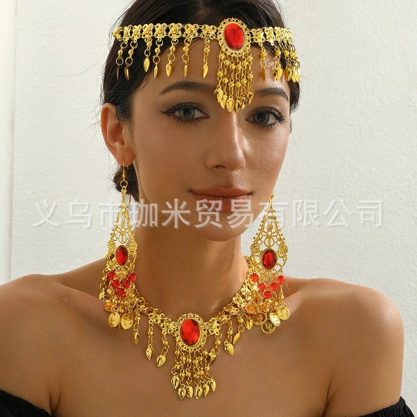 Ethnic Style Belly Dance Ruby Necklace Headband Earrings Indian Dance Accessories Set Heavy Industry High-End Design
